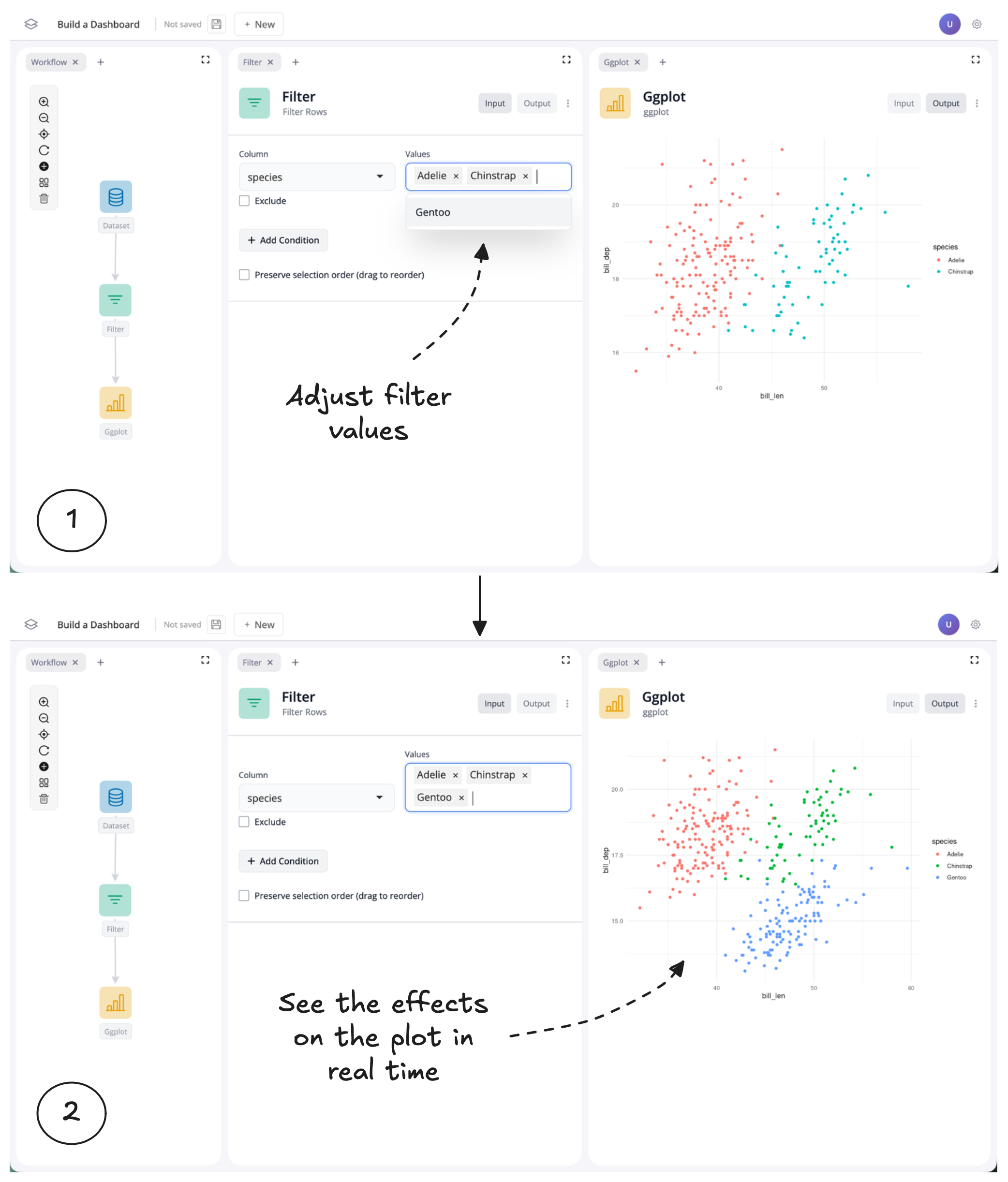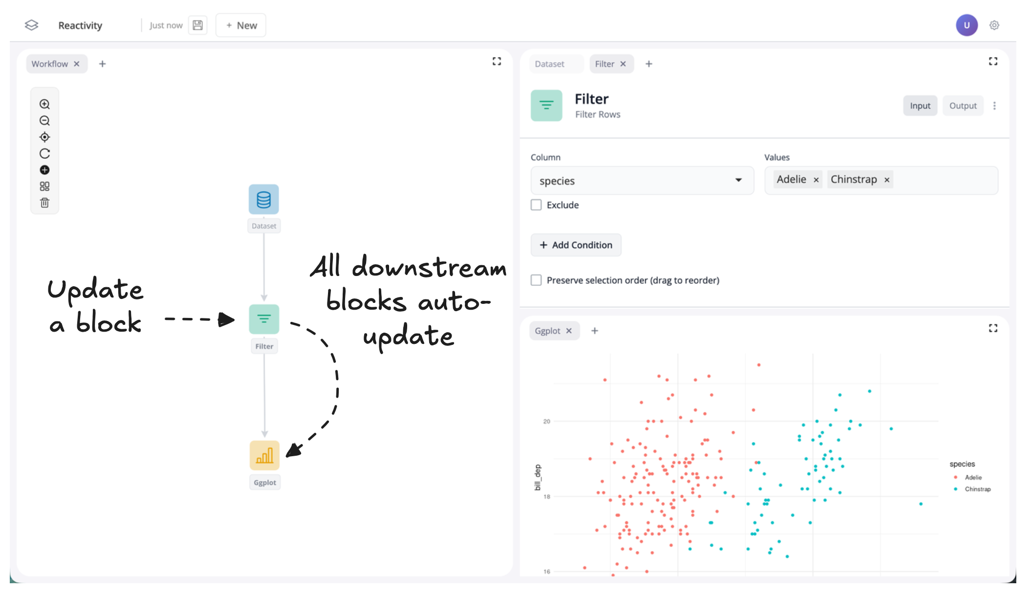This happens because the downstream filter and plot blocks user variables from the penguins dataset. When this dataset changes, these variables are no longer available and so the downstream blocks error to let us know they are trying to use variables that no longer exist. In this instance to fix these errors, we just need to update the variables used in the downstream blocks to those found in the new dataset.