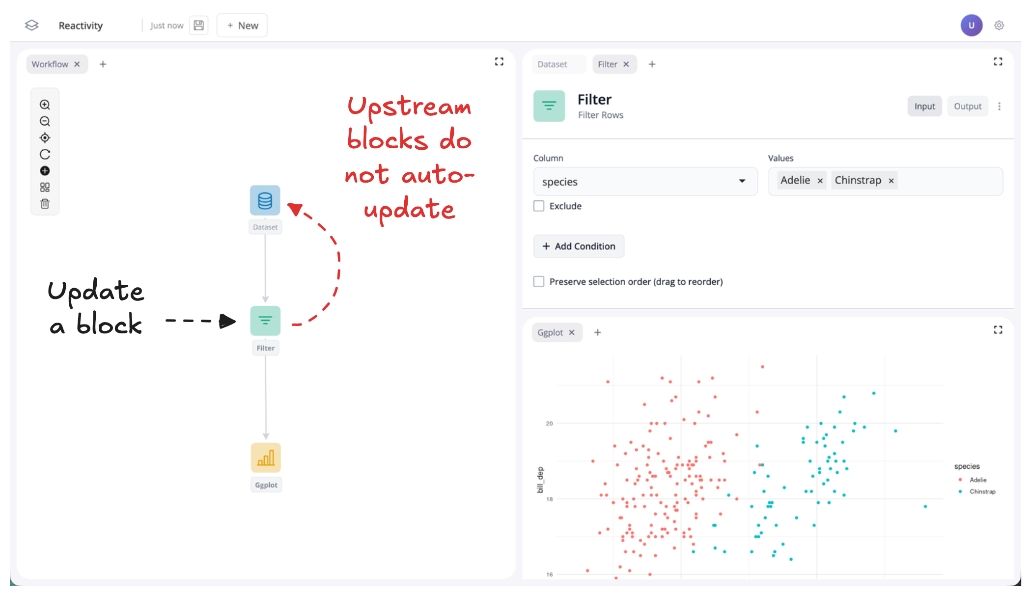 Note that upstream blocks never get updated. In our simple example, this means that our data block does not get updated, because it is upstream of our filter block: