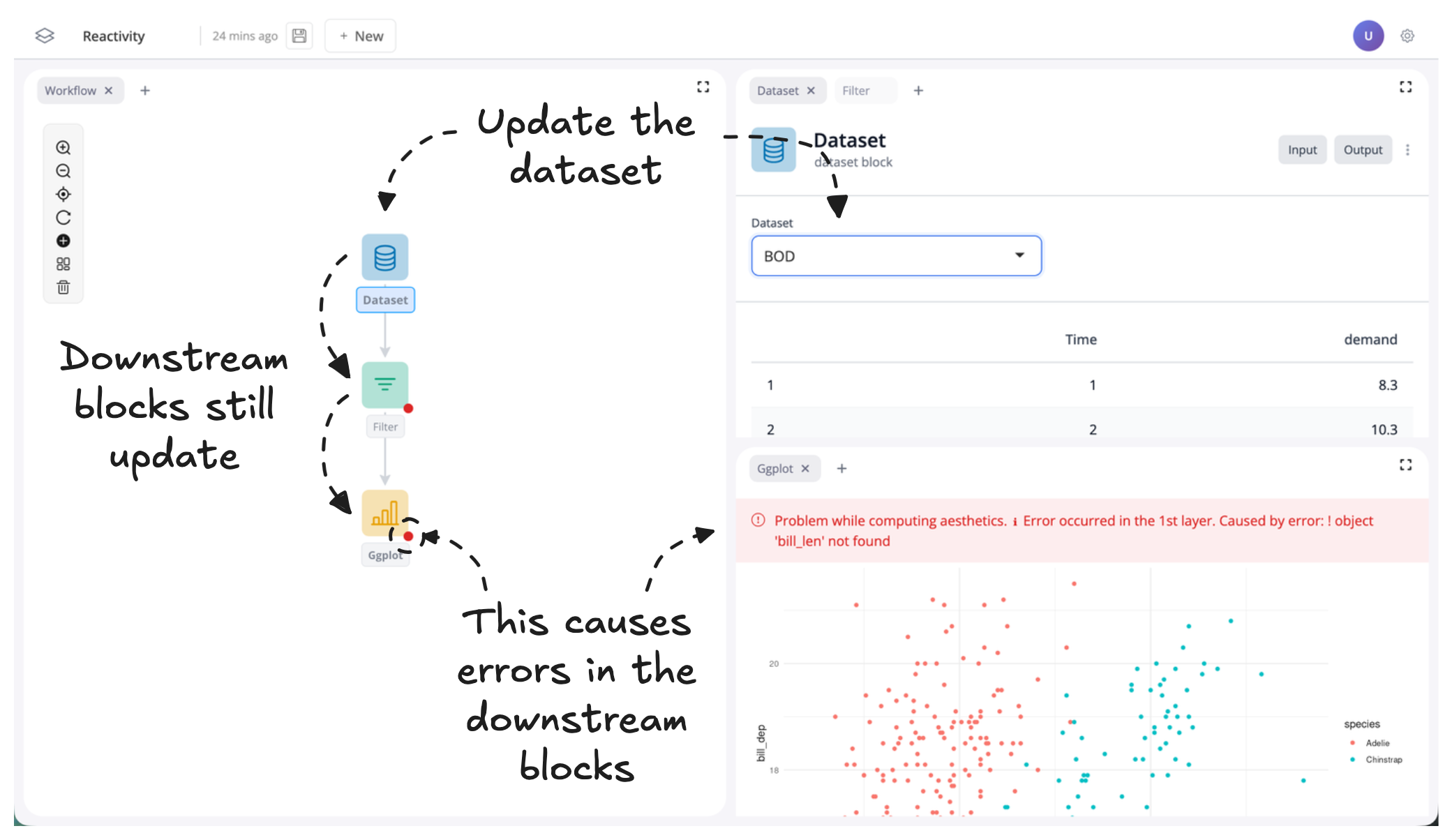 For example, again using our simple penguins dashboard, if we update the dataset block to use a dataset other than penguins, it will causes errors downstream: