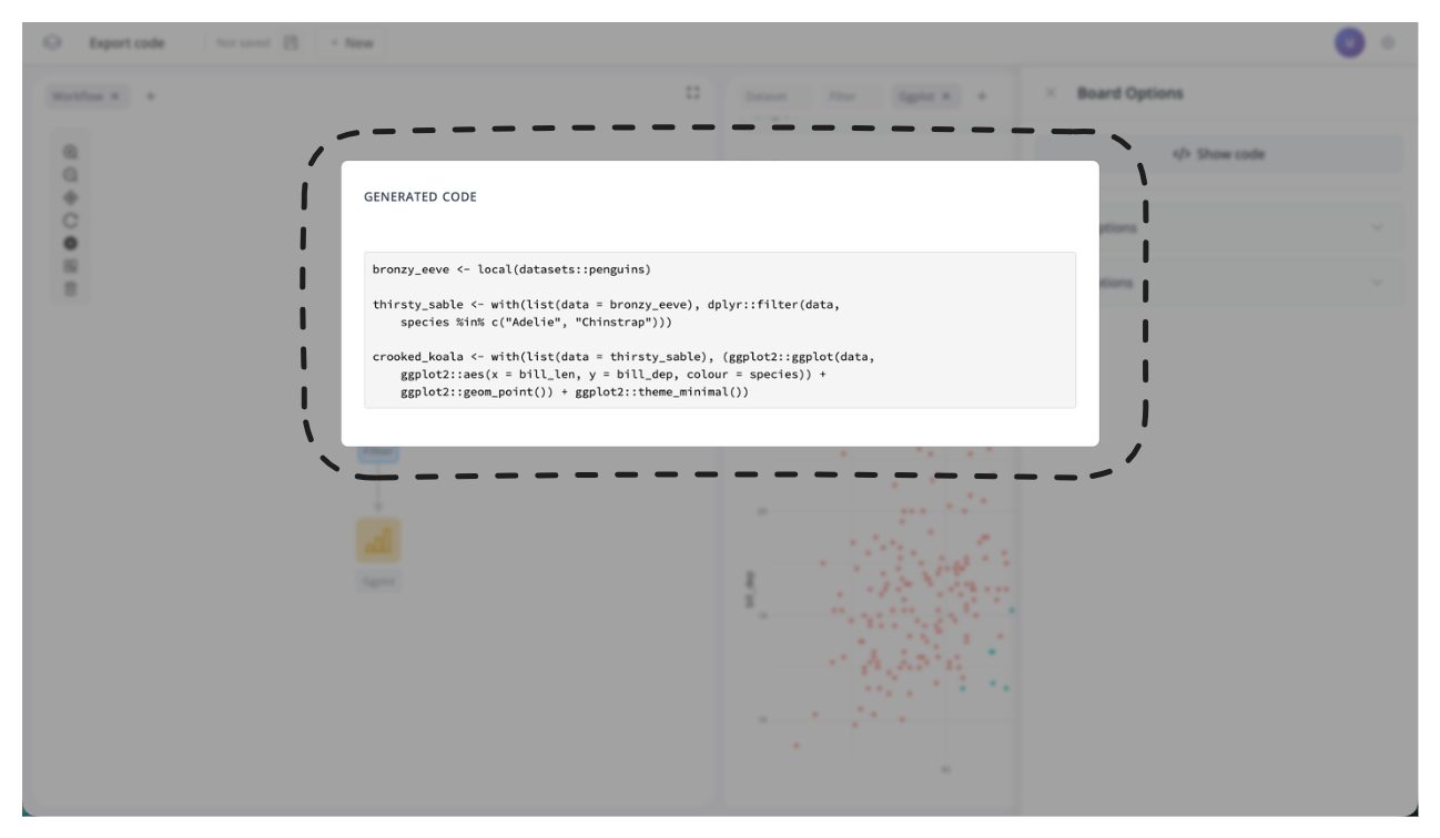 - That's it! Idiomatic R code will appear in a pop-up modal. Copy and paste it where you like.